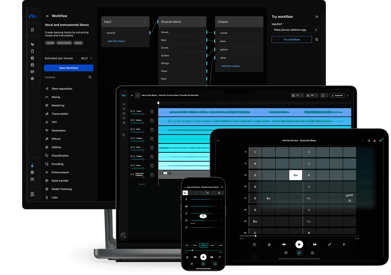 Music AI offers a powerful ecosystem of products for a diverse array of users in the music, audio and video production industries, ranging from novice musicians to world-class professionals. From supporting music creation to delivering solutions for business challenges, Music AI is creating the future of audio innovation.
